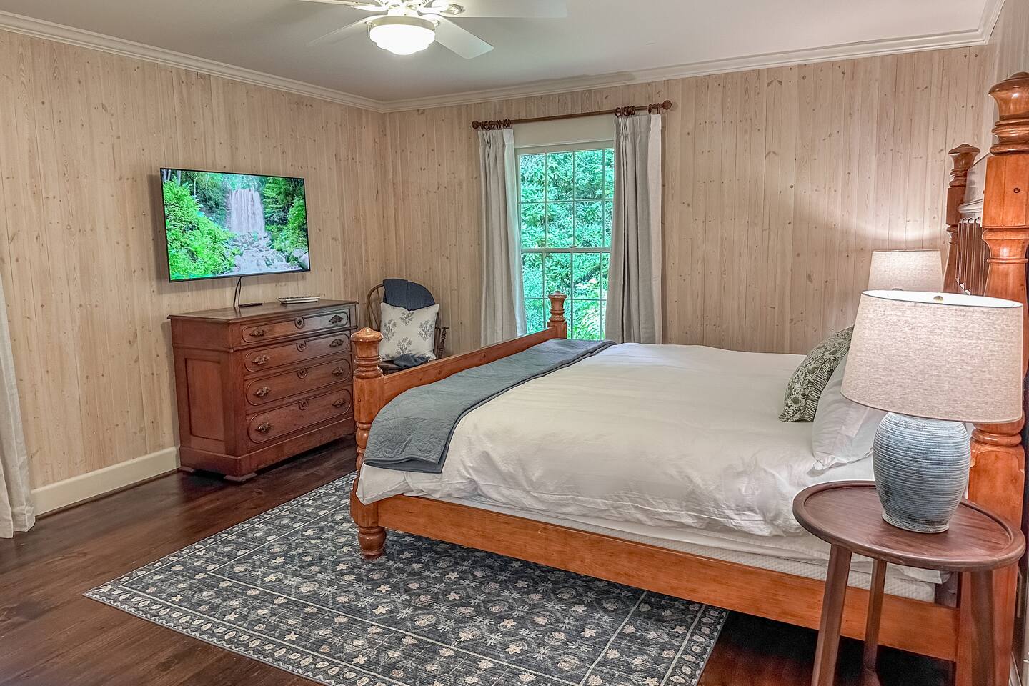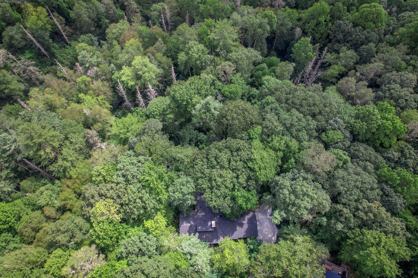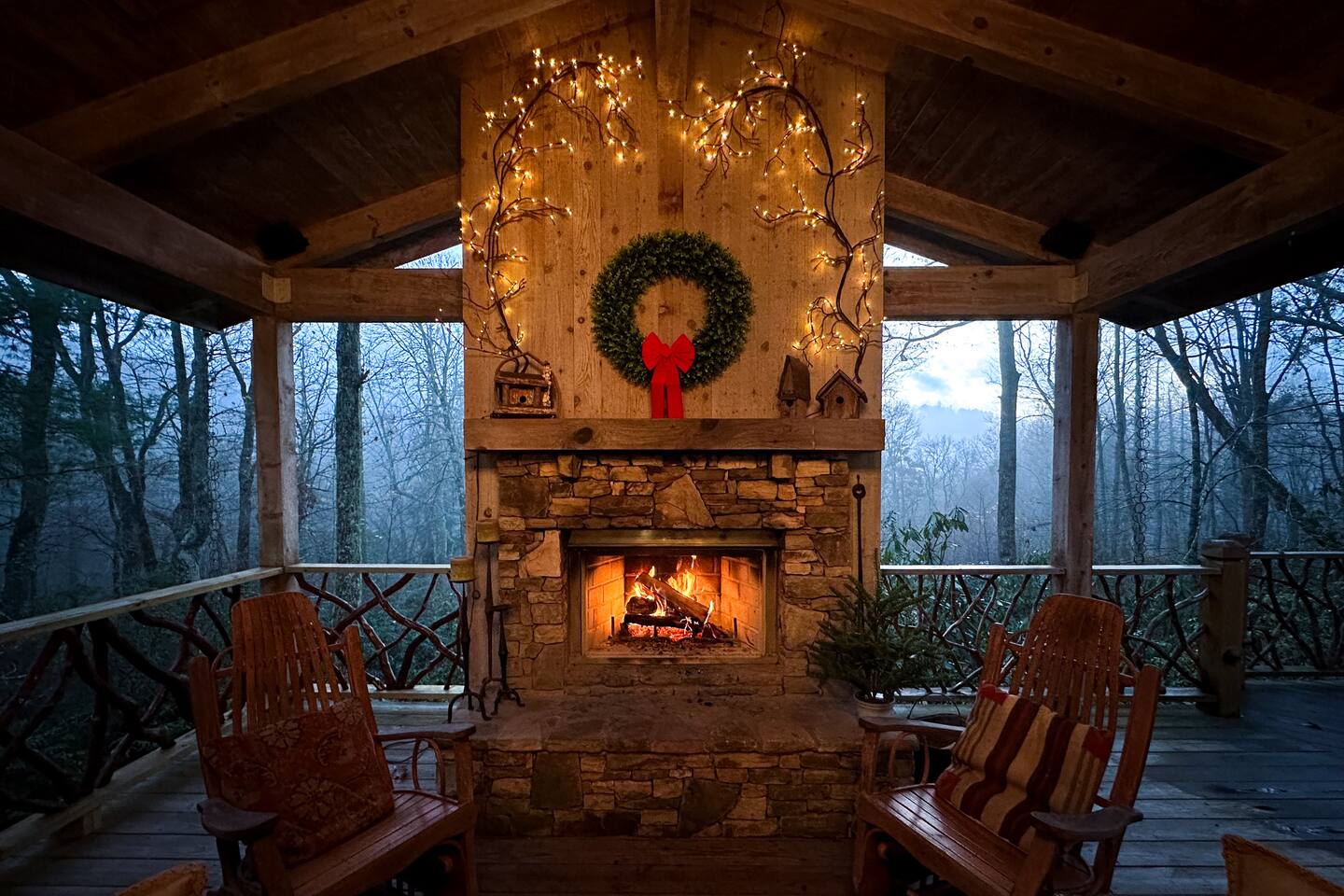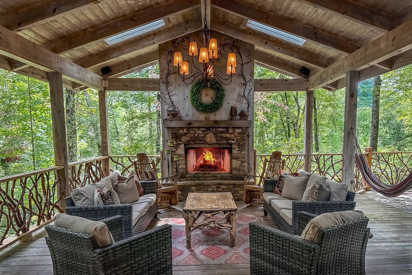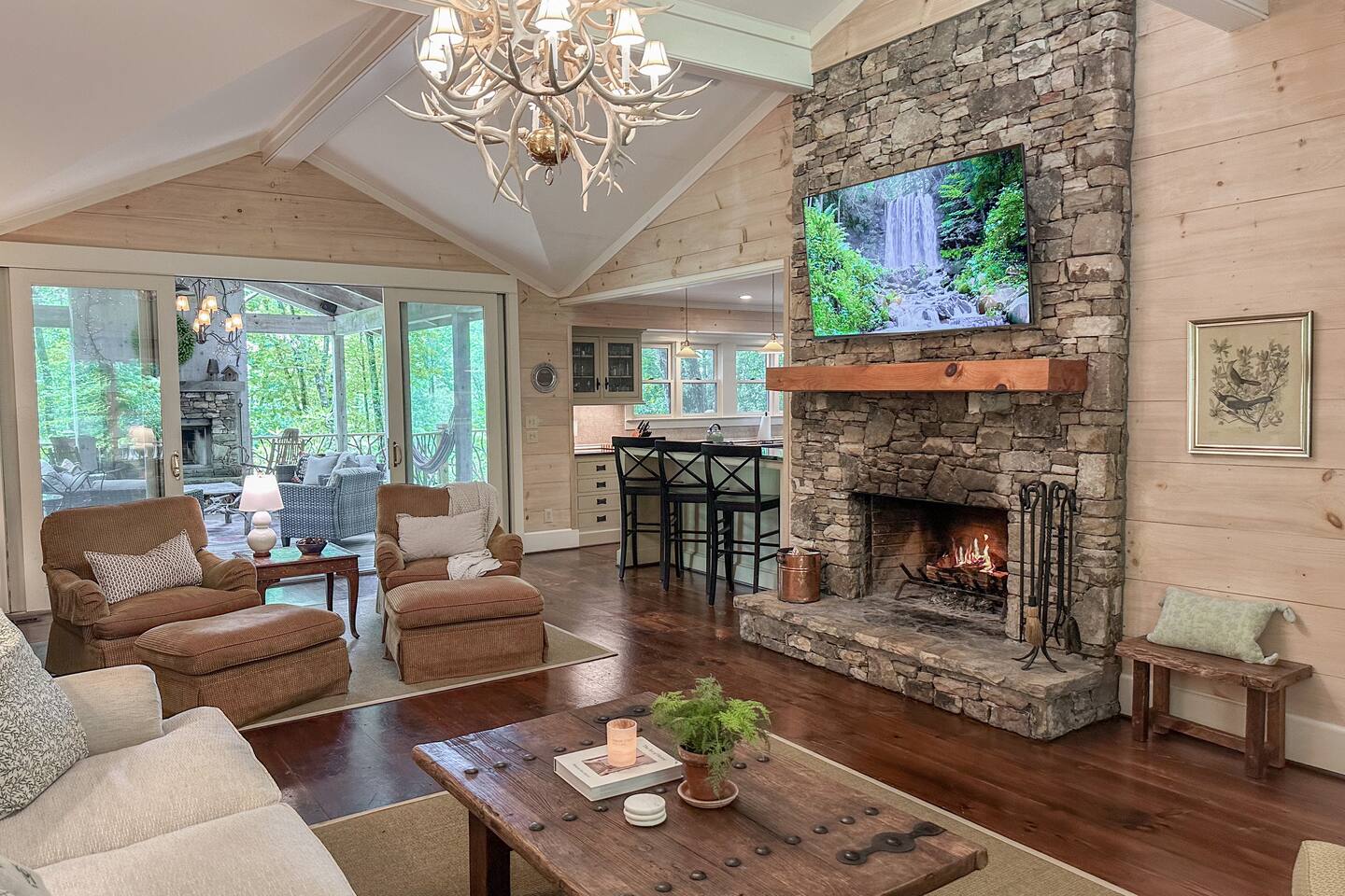 GREAT ROOM - Wood burning fireplace - 65" Smart TV with complimentary Netflix - Vaulted Ceilings - Sky Lights - Built-in Audio System for streaming music - Opens on to covered back deck KITCHEN - Fully stocked - 2 Ovens - Coffee Station - Smart TV - Built-in Audio System for streaming music - View of forest from sink - Granite & Soapstone countertops - Pantry connecting to dining room DINING ROOM - Seats 8 with room to pull up 2 more chairs COVERED DECK - Wood burning fireplace - Forest views on all sides - Built-in Audio System for streaming music - Gas Grill - Dining Table LOWER-LEVEL DEN - Smart TV - Games and Toys BEDROOMS - Wildflower Room (Main-level Primary Suite): 1 King Bed - Laurel Room (Lower-level Primary Suite): 1 Queen Bed, Office Space, library with sitting area - Forest Room: 1 Queen Bed - Mushroom Room: 1 Queen Bed - River Room: 1 Queen Bed *Smart TVs in every bedroom BATHROOMS - Wildflower Bath: Walk-in shower - Laurel Bath: Walk-in shower - Main-Level Hall Bath (Shared by River and Mushroom Rooms): Tub/shower combo - River Room Bath: Tub/shower combo