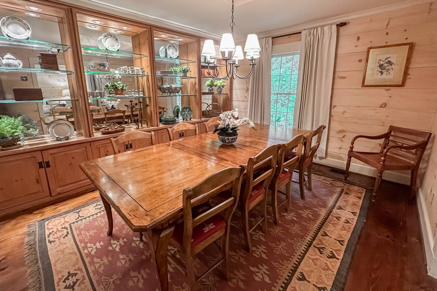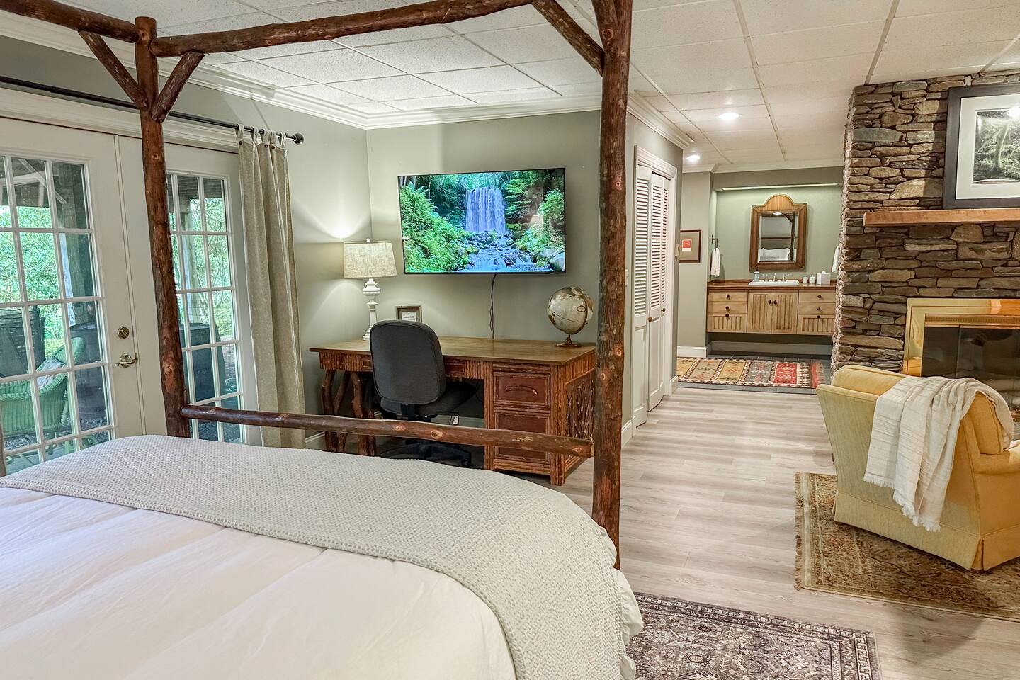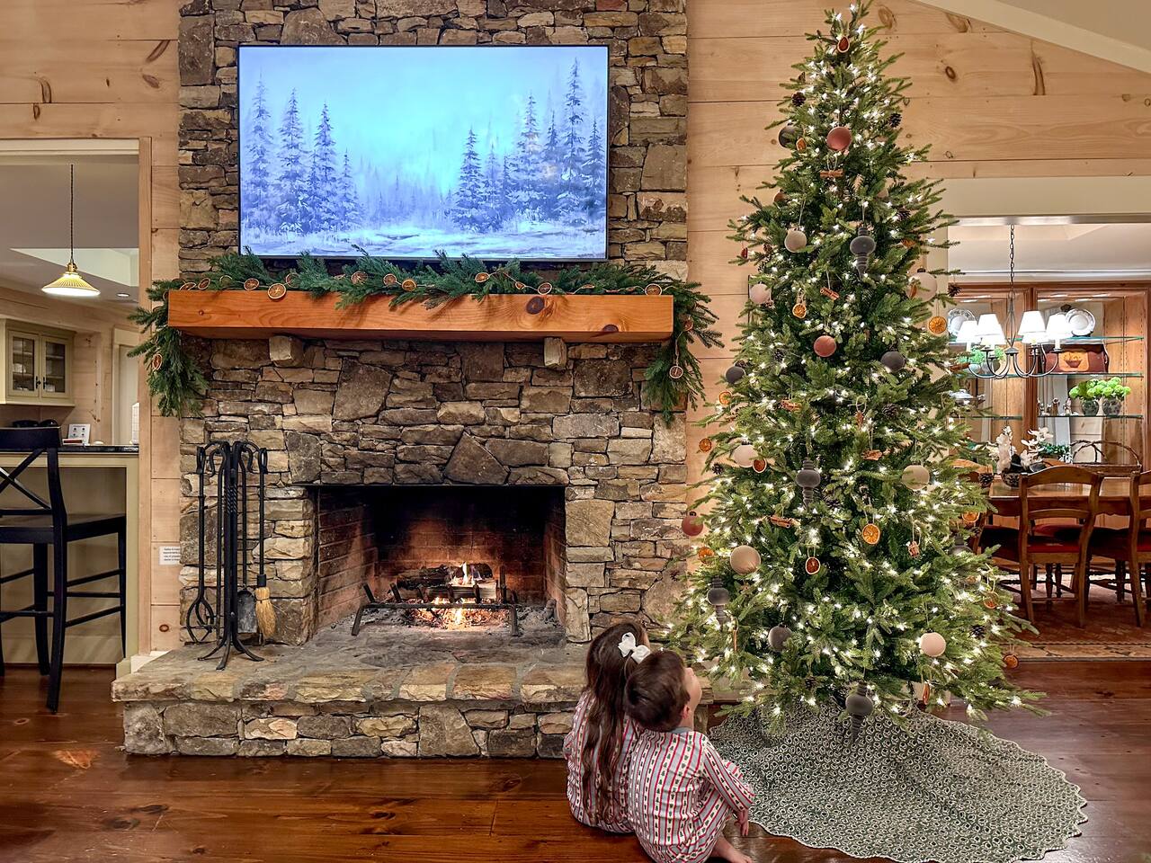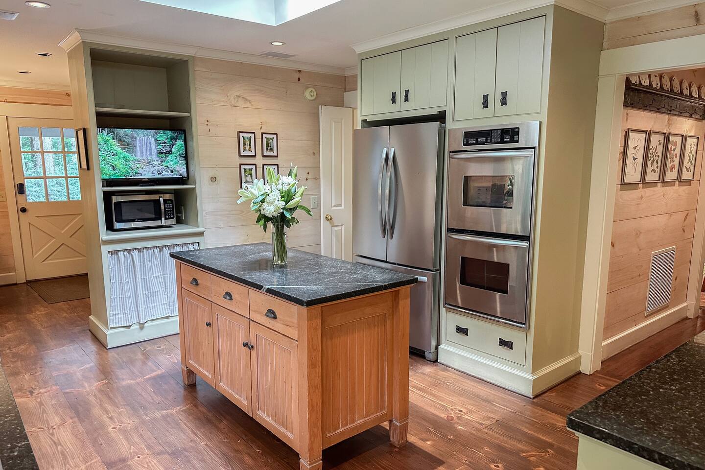 GREAT ROOM - Wood burning fireplace - 65" Smart TV with complimentary Netflix - Vaulted Ceilings - Sky Lights - Built-in Audio System for streaming music - Opens on to covered back deck KITCHEN - Fully stocked - 2 Ovens - Coffee Station - Smart TV - Built-in Audio System for streaming music - View of forest from sink - Granite & Soapstone countertops - Pantry connecting to dining room DINING ROOM - Seats 8 with room to pull up 2 more chairs COVERED DECK - Wood burning fireplace - Forest views on all sides - Built-in Audio System for streaming music - Gas Grill - Dining Table LOWER-LEVEL DEN - Smart TV - Games and Toys BEDROOMS - Wildflower Room (Main-level Primary Suite): 1 King Bed - Laurel Room (Lower-level Primary Suite): 1 Queen Bed, Office Space, library with sitting area - Forest Room: 1 Queen Bed - Mushroom Room: 1 Queen Bed - River Room: 1 Queen Bed *Smart TVs in every bedroom BATHROOMS - Wildflower Bath: Walk-in shower - Laurel Bath: Walk-in shower - Main-Level Hall Bath (Shared by River and Mushroom Rooms): Tub/shower combo - River Room Bath: Tub/shower combo