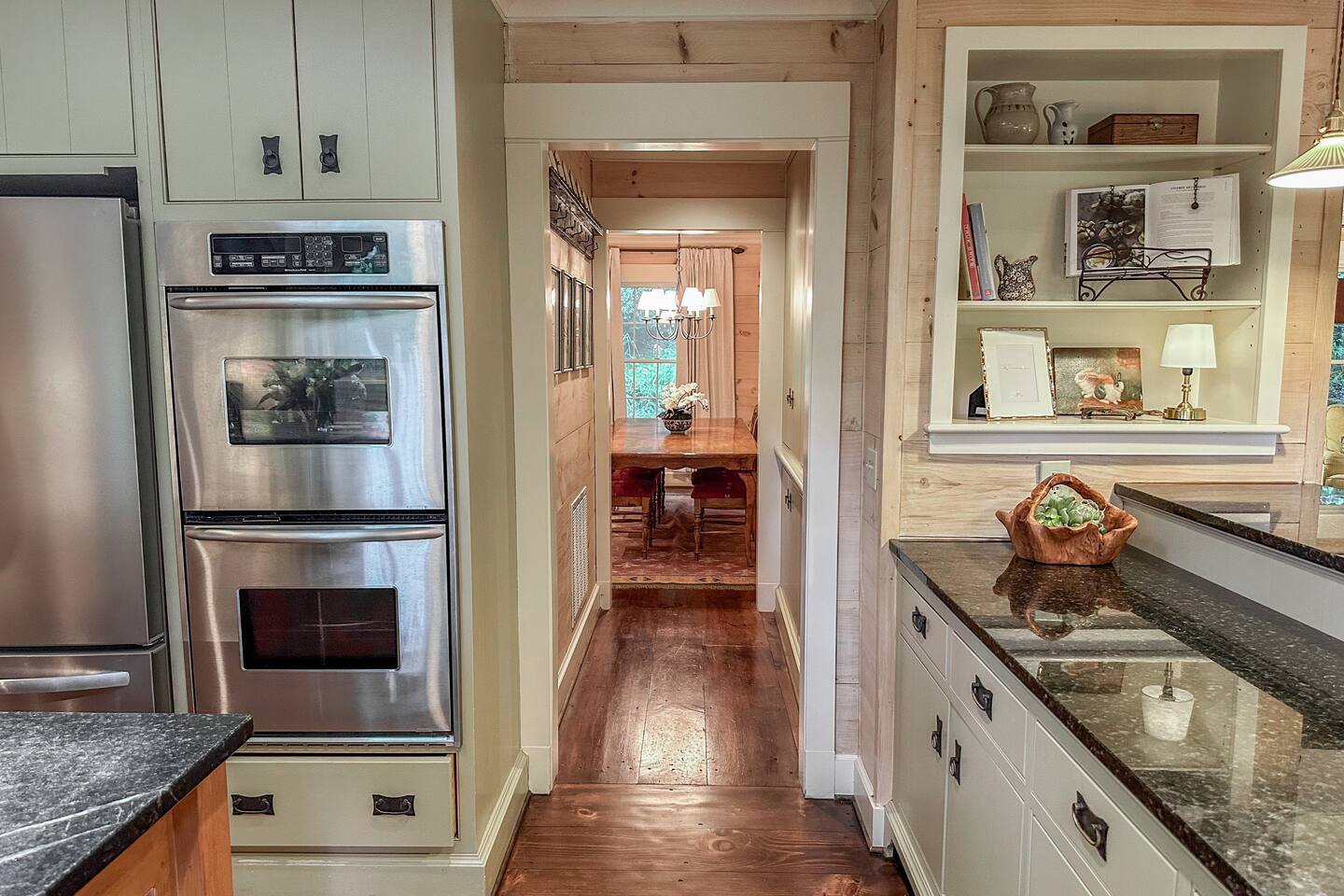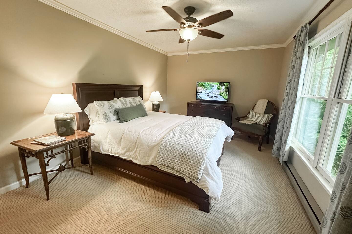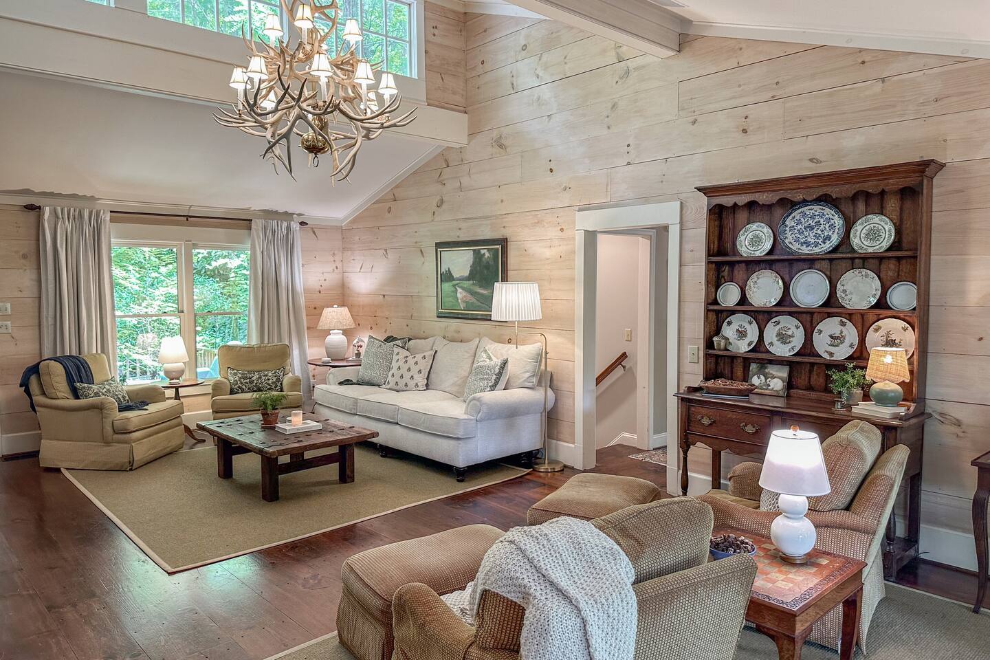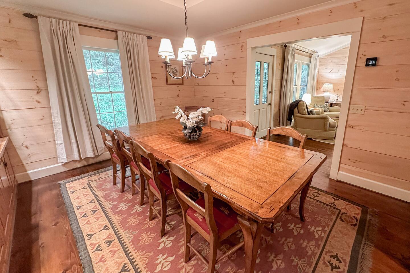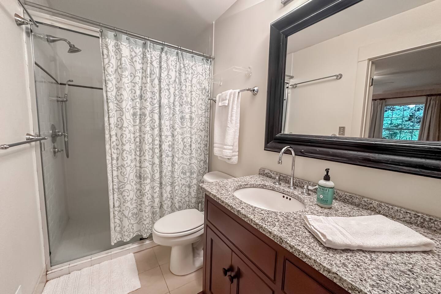 GREAT ROOM - Wood burning fireplace - 65" Smart TV with complimentary Netflix - Vaulted Ceilings - Sky Lights - Built-in Audio System for streaming music - Opens on to covered back deck KITCHEN - Fully stocked - 2 Ovens - Coffee Station - Smart TV - Built-in Audio System for streaming music - View of forest from sink - Granite & Soapstone countertops - Pantry connecting to dining room DINING ROOM - Seats 8 with room to pull up 2 more chairs COVERED DECK - Wood burning fireplace - Forest views on all sides - Built-in Audio System for streaming music - Gas Grill - Dining Table LOWER-LEVEL DEN - Smart TV - Games and Toys BEDROOMS - Wildflower Room (Main-level Primary Suite): 1 King Bed - Laurel Room (Lower-level Primary Suite): 1 Queen Bed, Office Space, library with sitting area - Forest Room: 1 Queen Bed - Mushroom Room: 1 Queen Bed - River Room: 1 Queen Bed *Smart TVs in every bedroom BATHROOMS - Wildflower Bath: Walk-in shower - Laurel Bath: Walk-in shower - Main-Level Hall Bath (Shared by River and Mushroom Rooms): Tub/shower combo - River Room Bath: Tub/shower combo
